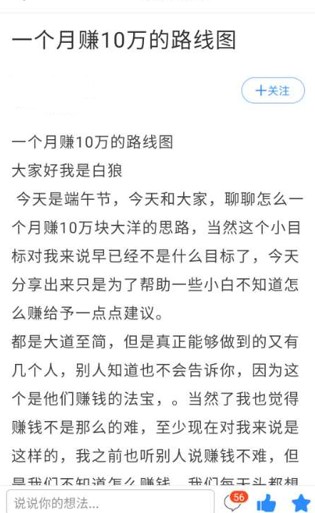 这个也是造神 ,因为一个粉丝加你,很大一部分首先会看你们朋友圈,而你们朋友圈早就自己布局好了的,那么对于你们来说,他对你们信任就会增加,那么我们今天晚上第一步,就是自己拿出一个微信号,开始打造朋友圈,每天给我发三个个说说,不发生活东西,只发怎么赚钱,说说内容二个方向,看看同行培训师发什么,改编他们的或许模仿他们,比如做小说项目培训的,肯定不止一个人做小说培训,做社群的,肯定不止一个,还有什么泡妞培训的,微信营销培训的,意思是我们先要选定一个行业,他们怎么分享,你们就改编他们的,分享,中国10亿网民,你们一二年赚给二三千个人够了,你们不懂的就培训社群。记住,网赚最赚钱的事培训行业,不是什么项目执行,网赚项目累死累活赚不了几个钱,淘宝买,这样吧,今天给大家一个造神主题“我是怎么在一年内赚到200万的”你们给我去编,一千个字,你们写好了找一个平台去发,一定会有很多人看的,测试看看有多少浏览量,一般有哪些平台适合发这些东西?各大论坛都可以,每天一个造神主题,练一个星期就知道怎么造神了,之后就开始引流。
